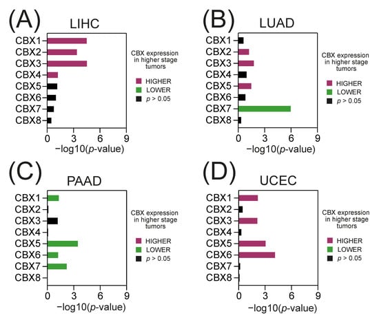 The association between CBX family members and disease stage in selected TCGA tumors. The association between CBXs expression and tumor stage—either lower (green) or higher stage (purple), as determined with the Spearman correlation test (−log10(p-value)) in (A) LIHC, (B) LUAD, (C) PAAD, and (D) UCEC data.