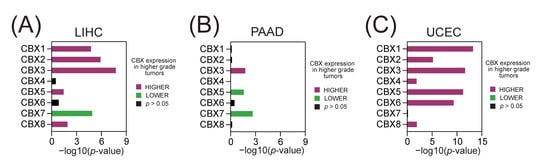 The association between CBX family members and tumor grade in selected TCGA tumors. The association between CBXs expression and tumor grade—either lower (green) or higher stage (purple), as determined with the Spearman correlation test (−log10(p-value)) in (A) LIHC, (B) PAAD, and (C) UCEC data.