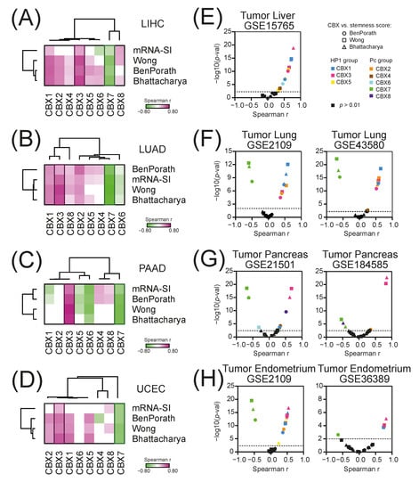 The correlation of CBX family members expression with cancer stemness. (A–D) The heatmaps of Spearman’s correlation between CBXs’ expression and four distinct stemness indices (mRNA-SI, Ben-Porath signature, Wong signature, Bhattacharya signature) in (A) LIHC, (B) LUAD, (C) PAAD, and (D) UCEC tumors. Purple and green denote either positive or negative correlation, respectively. Only statistically significant associations are shown (p < 0.05). (E–H) The correlation of CBX expression with cancer stemness scores in several additional datasets for (E) liver, (F) lung, (G) pancreatic, and (H) endometrial tumors. CBX members are color-coded as presented in the legend. Circles, squares, and triangles encode for Ben-Porath, Wong, and Bhattacharya signatures, respectively. Statistically insignificant correlations are colored in black.