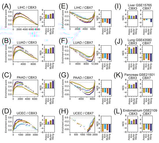 Using the GSEA, we compared the CBX3 and CBX7-associated transcriptome profiles with a priori defined stemness-associated gene signatures derived from the StemChecker database (Table S2) []. Figure S4 presents CBX3 and CBX7-associated transcriptome profiles in LIHC, LUAD, PAAD, and UCEC tumors defined as all significantly correlated genes (Spearman correlation, FDR < 0.01) to CBX3 and CBX7, respectively. We confirmed significant enrichment of CBX3-associated transcriptome profiles (Figure 6A–D) followed by significant depletion of CBX7-related transcriptome profiles (Figure 6E–H) with stem cell markers in all 4 tested tumors, which was further validated with several additional GEO datasets (Figure 6I–L). This strongly support our first observation of CBX3 being positively and CBX7 being negatively correlated with tumor stemness.