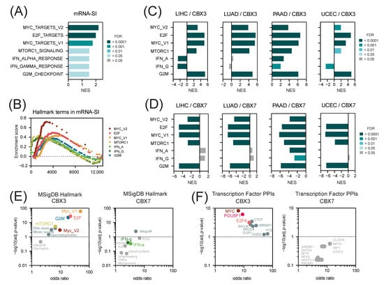 The transcriptome profiles associated with the expression of CBX3 are enriched with c-Myc and E2F transcription factor targets that significantly mirror the enrichment of mRNA-SI gene signature with the “Hallmarks of cancer” terms. (A,B) The enrichment of mRNA-SI gene signature with the „Hallmarks of cancer” terms determined using the GSEA analysis with the MSigDB Hallmark (v7.4) collection as a reference. Bars—Normalized Enrichment Score (NES). Bars are color-coded according to the statistical significance (FDR) as shown in the legend. (C,D) The CBX3-associated transcriptome profiles are enriched (C) while the CBX7-associated transcriptome profiles are depleted (D) with the “Hallmark of cancer” terms specific for cancer stem cell-like tumors. Bars—Normalized Enrichment Score (NES). Bars are color-coded according to the statistical significance (FDR) as shown in the legend. (E) The Enrichr tool [] confirmed significant enrichment of CBX3-related gene expression profile with targets for c-Myc and E2F transcription factors. The top 100 most relevant genes for CBX3 (left panel) and CBX7 (right panel) determined with ARCHS4 RNA-seq gene-gene co-expression matrix were used as inputs, and MSigDB Hallmark collection was used as a reference. (F) Additionally, the Enrichr tool revealed significant enrichment of CBX3-related gene expression profile with targets for Oct-3/4 transcription factor (encoded with POU5F1 gene).