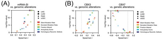 We further analyzed the abundance of genomic alterations in stem cell-like tumors. As presented in Figure 8A, we observed significant positive correlation between mRNA-SI and genomic alterations in LIHC, LUAD, PAAD, and UCEC tumors as determined with several distinct aberration quantifiers []—silent and non-silent mutations rates, the aneuploidy score, fraction of altered genome, and homologous recombination defect score. In LIHC, LUAD, and PAAD we also observed significant positive association between CBX3 level and the abundance of genomic alterations (Figure 8B), that strongly mirrors the results obtained for mRNA-SI. On the other hand, CBX7 expression negatively correlates with genomic alterations, especially in LUAD and PAAD tumors (Figure 8B), which corresponds to the negative association between CBX7 and cancer stemness.