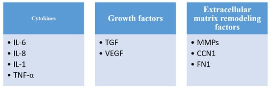 The components of SASP are numerous, but the most important ones are: interleukin (IL) 6, 8 and 1, tumor necrosis factor alpha (TNF-α), transforming growth beta (TGF), vascular endothelial growth factor (VEGF), matrix metalloproteinases (MMPs), protein CCN1 and fibronectin1 (FN1).