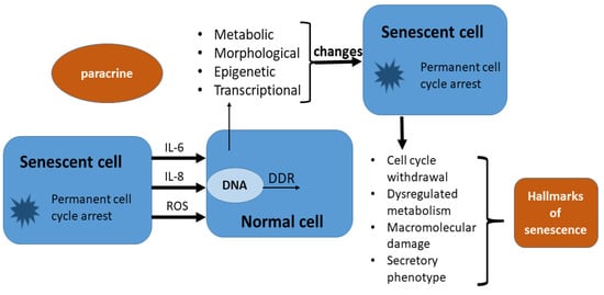 The bystander effect: senescent cells are more secretory active than non-senescent cells and paracrine can affect young cells and induce the start of the senescence process in them. This is accomplished through proinflammatory cytokines and reactive oxygen species (ROS) which cause deoxyribonucleic acid (DNA) damage and initiate DNA damage response (DDR). In this way, the normal cell enters in permanent cycle arrest or senescence. Hallmark of senescence is defined by Gorgoulis et al. [26].
