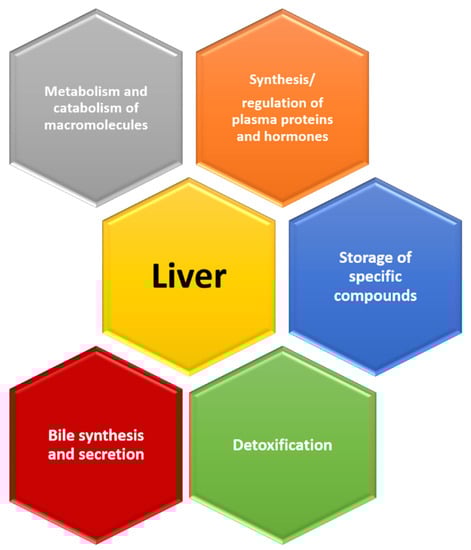 The liver is an organ that has several important roles in our body: metabolism of carbohydrates, proteins and lipids, synthesis/regulation of plasma proteins and hormones, storage of specific compounds, detoxification, bile synthesis and secretion, catabolism of different molecules, etc. [13] (Figure 4). Changes at the level of the liver parenchyma have been extensively investigated, and the results are important also because of the possibility of transplantation of this organ in end-stage liver disease [13].