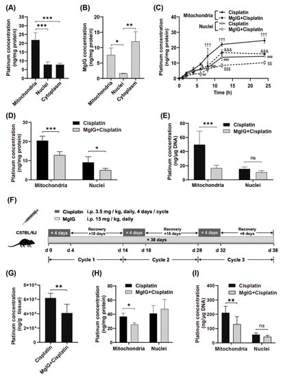 MgIG reduces the concentration of cisplatin in mitochondria and target-binding amount to mtDNA. (A) The subcellular distribution of platinum in HK-2 cells, n = 5. Cisplatin tends to accumulate in mitochondria. (B) The subcellular distribution of MgIG in HK-2 cells, n = 3. MgIG amount in mitochondria is higher than that in nuclei. (C) The concentration–time process of platinum in mitochondria and nuclei of HK-2 cells, n = 3. (D) The subcellular distribution of platinum after MgIG combination in HK-2 cells for 24 h, n = 5. Co-treatment with MgIG reduces the accumulation of cisplatin in mitochondria. (E) The effect of MgIG on the concentration of platinum bound to DNA, n = 5. MgIG specifically reduces platinum–mtDNA level. (F) Flow chart of administration to mice in the designated groups. (G) The platinum concentration in kidneys, n = 6. Combination with MgIG reduced platinum concentration in kidneys. (H,I) The concentration of platinum and its binding amount to DNA in mitochondria and nuclei of kidneys. MgIG reduced the concentration of platinum in mitochondria and its binding to DNA in kidneys. The data are presented as the mean ± SD. * p < 0.05, ** p < 0.01, *** p < 0.001,ns indicates no significant difference; ††† p < 0.001 the Mitochondria–cisplatin group versus the Mitochondria–MgIG + cisplatin group; & p < 0.05, &&& p < 0.001 the Nuclei–MgIG + cisplatin group versus the Mitochondria–MgIG + cisplatin group; ## p < 0.01, ### p < 0.001 the Mitochondria–cisplatin group versus the Mitochondria–cisplatin group; and $$ p < 0.01, $$$ p < 0.001 the Nuclei–cisplatin- group versus the Nuclei–MgIG + cisplatin group.