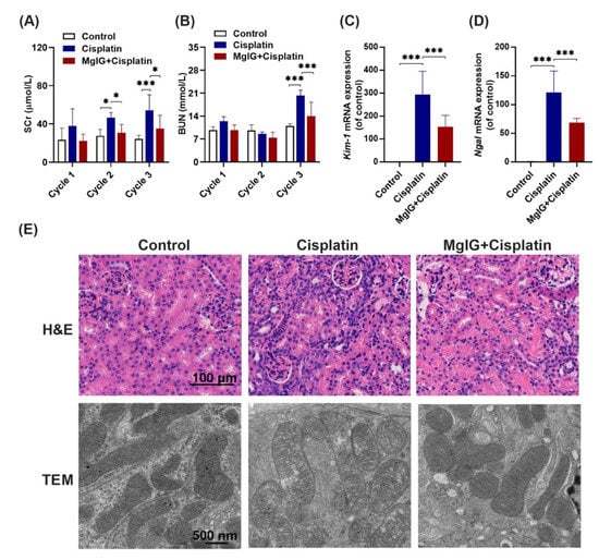 MgIG significantly ameliorates cisplatin-induced renal injury. (A,B) The levels of SCr and BUN in mice over 3 cycles. (C,D) The mRNA expression levels of KIM-1 and NGAL in mouse kidneys at the end of cycle 3. Combination with MgIG attenuated the elevation of SCr, BUN, KIM-1, and NGAL caused by cisplatin in mice. (E) Representative H&E staining of renal mouse tissue (scale bar = 100 μm) and TEM micrographs of renal tubular epithelial cell mitochondria (scale bar = 500 nm) from each group. Co-treatment with MgIG prevented mitochondrial ultrastructural abnormalities in renal tubules against cisplatin. The data are presented as the mean ± SD, n = 8. * p < 0.05, *** p < 0.001.