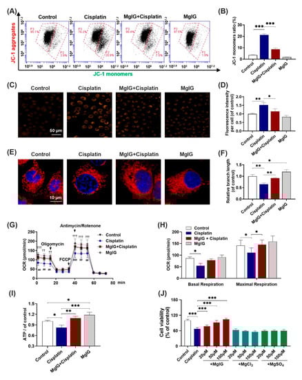 2.3. MgIG Notably Alleviates Cisplatin-Induced Mitochondrial Dysfunction