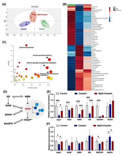 MgIG markedly ameliorates cisplatin-induced energy metabolism disorder and recovers NAD+ biosynthesis. (A) Partial Least Squares Discrimination Analysis (PLS-DA) plot depicting the differences in kidneys from three assigned groups, n = 7. There is a clear distinction between the groups. (B,C) Heat maps and KEGG pathway analysis of differential compounds in kidneys from the three assigned groups. Combination with MgIG improved cisplatin-induced energy metabolism disorder. Red circles represent high p value, yellow circles represent low p value, the sizes of the circles are proportional to the pathway impact, n = 7. (D) The main biosynthesis pathways of NAD+. (E) The levels of NAD+, NADH, NAM, NMN, NR, and NADPH in the kidneys, n = 5. (F) The levels of NAD+, NADH, NAM, NMN, NR, and NADPH of HK-2 cells in the assigned groups, n = 3. Combination with MgIG increased the reduction of NAD+ and related substances stimulated by cisplatin. The data are presented as the mean ± SD. * p < 0.05, *** p < 0.001.