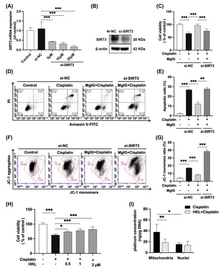 SIRT3 mediates the protective effect of MgIG on mitochondrial dysfunction induced by cisplatin. SIRT3 was knocked down in HK-2 cells by transferring siRNA. (A,B) The mRNA and protein expression levels of SIRT3 in HK-2 cells, n = 3. (C–G) The cell viability, representative images of apoptosis, and JC-1 staining of HK-2 cells from the indicated groups, comparing SIRT3 knockdown with the si-NC group, and quantitative results, n = 4. SIRT3 knockdown weakened the protective effect of MgIG combination from cisplatin in HK-2 cells. (H) The cell viability of HK-2 cells treated with cisplatin and HKL, n = 5. HKL mitigated the proliferation inhibition of HK-2 cells against cisplatin. (I) The effect of HKL on the amount of platinum–mtDNA adducts and platinum–nDNA adducts, n = 5. HKL specifically reduced platinum–mtDNA level. The data are presented as the mean ± SD. * p < 0.05, ** p < 0.01, *** p < 0.001.