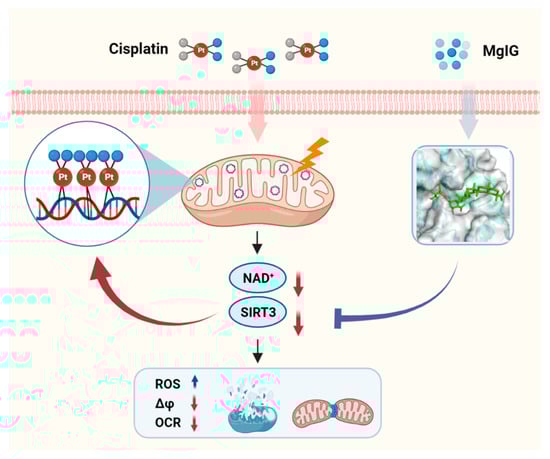 Schematic depicting the role of MgIG in cisplatin-induced kidney injury. Cisplatin tends to accumulate in the mitochondria of renal tubular epithelial cells and binds to mtDNA, causing a decrease in NAD+ and SIRT3, resulting in mitochondrial dysfunction and cytotoxicity. MgIG can bind to SIRT3 and reduce the target-binding amount of cisplatin to mtDNA, thus exerting a protective effect on cisplatin-induced renal injury through SIRT3.