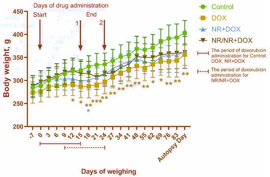 Death in the animals was not observed during the study. The body-weight dynamics for all the experimental groups are shown in Figure 1. A gradual increase in body weight was observed throughout the experiment for all animals. At the same time, there was a tendency to reduce the body-weight gain in rats of the DOX, NR+DOX, and NR/NR+DOX groups due to drug administration, which indicates the toxic effect of doxorubicin.