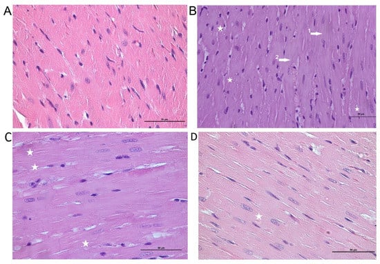 Cardiac muscle tissue. (A)—control group, normal structure. (B)—DOX group, dystrophic changes in cardiomyocytes: loss of striation (1,2 arrows) and vacuolization of the cytoplasm (stars). (C)—NR+DOX group, minimal alterative changes. (D)—NR/NR+DOX group, minimal alterative changes. Stained with hematoxylin–eosin, ×50. DOX represents doxorubicin group; NR+DOX represents nicotinamide riboside + doxorubicin group—combined mode; and NR/NR+DOX represents nicotinamide riboside/nicotinamide riboside + doxorubicin group—preventive mode.