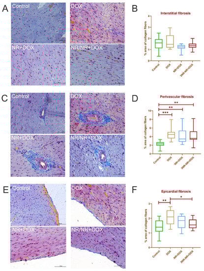 Morphometric values (% area of collagen fibers) in cardiac muscle. (A,B)—interstitial fibrosis; (C,D)—perivascular fibrosis; (E,F)—epicardial fibrosis. Collagen fibers are blue. Staining by Mallory, × 100. *—p < 0.05, **—p < 0.01, and ***—p < 0.001. Data are presented as median [25%; 75%]. Control represents control group (n = 15); DOX represents doxorubicin group (n = 15); NR+DOX represents nicotinamide riboside + doxorubicin group—combined mode (n = 15); and NR/NR+DOX represents nicotinamide riboside/nicotinamide riboside + doxorubicin group—preventive mode (n = 15).