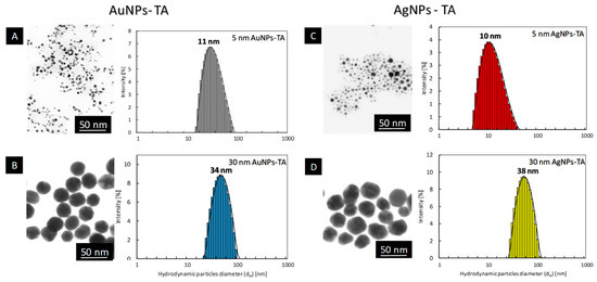 STEM images and DLS size distribution histograms of polyphenol-conjugated metallic nanoparticles: 5 nm AuNPs-TA (A); 30 nm AuNPs-TA (B); 5 nm AgNPs-TA (C); 30 nm AgNPs-TA (D).