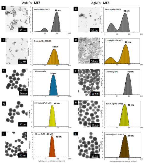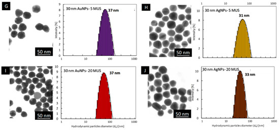 Nanoparticles with the size of about 30 nm functionalized with MES ligand were prepared by surface modification of citrate-stabilized nanoparticles (Figure 2E,F). Briefly, the physicochemical characteristic of those citrate-stabilized nanoparticles was as follow: the size of metallic core: dAuNPs = 31 ± 4 nm and dAgNPs 27 ± 7 nm, while the hydrodynamic diameter was equal: dH AuNPs = 34 ± 7 nm and dH AgNPs = 31 ± 8 nm, for AuNPs and AgNPs, respectively. Those nanoparticles were used for modification with MES ligand with the surface coverage equal 5 and 20 ligand molecules per 1 nm2 of nanoparticle surface. The physicochemical characterization of colloids after each functionalization is presented in Figure 2 G–J. The DLS results confirm the colloidal stability of nanoparticles after the functionalization process. The hydrodynamic diameter of MES-functionalized nanoparticles was equal: dH AuNPs-5MES = 34 ± 4 nm for 30 nm AuNPs-5 MES (Figure 2G), dH AgNPs-5MES = 32 ± 5 nm for 30 nm AgNPs-5 MES (Figure 2H), dH AuNPs20MES = 35 ± 6 nm for 30 nm AuNPs-20MES (Figure 2I), dH AgNPs-20MES = 34 ± 6 nm for 30 nm AgNPs-20MES (Figure 2J). The mean size of the metallic core of nanoparticles remains unchanged after the functionalization process and is equal dAuNPs = 31 ± 4 nm and dAgNPs = 27 ± 7 nm.