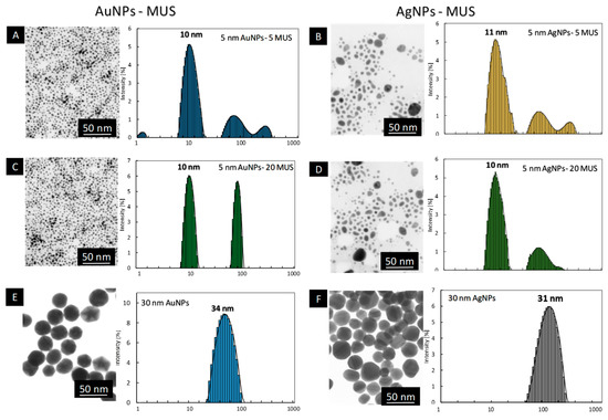 The physicochemical characterization of MUS-functionalized nanoparticles revealed the presence of spherical particles with the size of metallic core equal dAuNPs-MUS= 2.6 ± 1.0 nm for the syntheses 5 nm AuNPs-5MUS and 5 nm AuNPs-20MUS (Figure 3). The DLS measurements revealed the presence of intense peaks at 10 nm from single nanoparticles and around 100 nm from conglomerates (similar to the case of small nanoparticles synthesized with MES-ligand). Those conglomerates are formed in the solution and consist of single nanoparticles without the metallic connection between particles (STEM investigations do not revealed the presence of agglomerates or any larger objects). DLS measurements and the STEM investigations confirmed the stability of AuNPs functionalized with 5 and 20 MES molecules per 1 nm2 of NPs surface. The STEM images of AgNPs synthesized with 5 MUS molecules revealed the presence of spherical objects with the mean size of metallic core equal dAgNPs-MUS = 4.7 ± 1.6 nm. DLS measurements confirmed the colloidal stability of nanoparticles. The functionalization of 30 nm citrate AuNPs and AgNPs with MUS ligand allows for obtaining stable colloids, which was confirmed with DLS and STEM investigations (Figure 3G–J). The size of metallic core remains unchanged after MUS functionalization and is equal dAuNPs = 31 ± 4 nm and dAgNPs = 27 ± 7 nm. The DLS measurements revealed only small changes in the hydrodynamic size of nanoparticles after MUS modification, which is connected with the small size of the MUS molecule. The hydrodynamic size of MUS-functionalized 30 nm AuNPs increased from dH AuNPs = 34 nm measured for citrate AuNPs to dH AuNPs-5MUS = 37 nm for MUS functionalized AuNPs (both 5 and 20 MUS molecules per 1 nm2 of NPs surface). For 30 nm AgNPs the hydrodynamic size was equal dH AgNPs = 31 nm for citrate AgNPs and dH AgNPs-5MUS = 31 nm and dH AgNPs-20MUS = 33 nm for 5 and 30 MUS, respectively. The shape of nanoparticles functionalized with MUS-ligand is spherical in all cases.