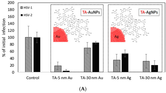 Hydrolyzable tannins are the other group of compounds that can target viral glycoprotein-glycosaminoglycan interactions and inhibit HSV-1 infection [27]. Tannins are compounds of natural origin from the group of polyphenols that exhibit antiviral activity [28,29]. Several other bioactive compounds are known for their antiviral activity, e.g., flavonoids, terpenoids, polyphenolics, lignans, coumarins, chlorophyllins, alkaloids, furyl compounds, thiophenes, proteins, peptides, etc. [30,31,32]. The antiviral activity of these compounds has been attributed to various mechanisms of action, including antioxidant activities, inhibition of DNA and RNA synthesis, and inhibition of viral entry to the host cell [33]. The compounds of natural origin which exhibit antiviral properties can be conjugated with nanoparticles and used as antiviral preparations [14,34,35,36]. The low toxicity, low side effects, and reduced likelihood of promoting antiviral resistance make antiviral drugs based on natural compounds up-and-coming candidates to combat pathogens effectively [34]. Nabila et al. fabricated a curcumin-based nanoemulsion to improve curcumin’s solubility and cell uptake efficacy, and they obtained a significant virus inhibitory effect [37]. Lin et al. showed that hydrolyzable tannins (chebulagic acid and punicalagin) could target viral glycoprotein-glycosaminoglycan interactions, inhibit HSV-1 entry, and prevent binding penetration, cell-to-cell spread, and secondary infection [27]. Those results suggest that the hydrolyzable tannins may be useful as competitors for glycosaminoglycans in managing HSV infections. Our previous work showed that tannic acid attached to the surface of AgNPs could block viral entry [14]. We have also demonstrated that the ability of NPs to neutralize HSV-2 viruses is size-dependent, proving that nanoparticles with a size of about 30 nm exhibit significantly better reducing HSV-2 infectivity (both in vitro and in vivo) than 13 nm and 46 nm-sized nanoparticles [34]. Moreover, the induction of antiviral cytokines and chemokines production by tannic-acid modified AgNPs, together with decreased inflammatory reaction in vivo, suggests that their activity is not restricted to virus inactivation, but tannic-acid modified silver nanoparticles consist of a potential microbicide for herpesvirus infection in the mucosal tissues [34]. Both HSV-1 and HSV-2 possess similar structures of surface proteins. Hence, tannic acid-modified metallic nanoparticles can be used as a microbicide to treat both HSV-1 and HSV-2 types of infection. This makes them interesting materials, especially in the context of the development of anti-HSV vaccines. As the surface of HSV-2 is composed of glycoproteins with N- or O-linked sugars, it may readily interact with tannic acid-functionalized-NPs and help nanoparticles to interact with the virus envelope and inhibit the infection. Moreover, the nanoparticles may be a physical barrier in virus-host cell interaction by binding to the virus surface. These earlier reports provide a strong background for our studies and suggest that the tannins conjugated to metallic nanoparticles constitute an excellent goal for HSV therapeutics.