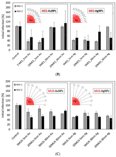 Inhibition of virus infection with the use of TA-conjugates (A), MES-conjugates (B), and MUS conjugates (C) of 5 and 30 nm AuNPs as well as 5 and 30 nm AgNPs. The efficiency of antiviral action was measured in plaque-forming units (PFU) and compared to untreated infected cultures. Results are expressed as % of untreated infection.