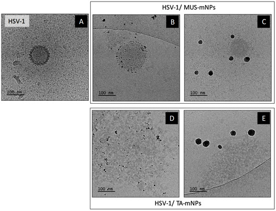 cryo-TEM images of unstained samples: HSV-1 virus (A), HSV-1 virus after incubation with: 5MUS_5nmAgNPs (B), 5MUS_30nmAgNPs (C) TA_5nmAgNPs (D), TA_30nmAgNPs (E) (samples imaged after about 30 s of incubation of virus with functional nanoparticles).