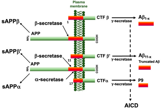 Summary scheme of the major APP processing pathways. The amyloid precursor protein is a type I transmembrane protein subject to sequential and alternative proteolytic cleavage. The β-secretase cleaves APP at the N-terminus of the Aβ peptide sequence to generate a soluble fragment sAPPβ and a carboxy-terminal fragment CTFβ. This β-secretase can alternatively cleave APP at position 11 and generate sAPPβ’ and CTFβ’. The α-secretase cleavage at position 17 precludes the Aβ formation and generates sAPPα and CTFα. All CTFs can be further processed by the γ-secretase to generate the Aβ1–x, Aβ11–x, P9, and amyloid intracellular domain (AICD).