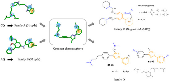We have recently developed two families of compounds derived from either CQ (family A) or amodiaquine (AQ, family B) (Figure 2) that demonstrated a strong inhibitory effect on both Aβ1–40 and Aβ1–42 secretions [13,14,15,16,17,18,19]. These effects were associated with a strong increase in αCTFs and AICD levels. These families of molecules interact with the autophagic/endolysosomal systems, some of which have been shown to be effective against both amyloid and Tau pathologies in vivo [14,17]. The lead compound of family A is currently in a phase II clinical trial for the treatment of tauopathy progressive supranuclear palsy [20]. To try to identify new and more efficient compounds in the absence of a defined molecular target of the previously developed compounds, a ligand-based computer-assisted pharmacophore modeling approach [21], coupled with a de novo design, was implemented. In the first paper, we described a new family of compounds based on a biaryl scaffold decorated with amino side chains (family C, Figure 2) [22]. Among these compounds, several were shown to inhibit Aβ1–x peptide secretion and to promote αCTFs and AICD stabilities as the parent compounds (families A and B). In this previous structure–activity relationship based on the analysis of APP metabolism and markers of autophagy, non-competitive β-secretase inhibitors with or without a lysosomotropic activity were identified [22]. Interestingly, compound PEL24–199 (compound 31 in [22]) with n = 3, m = 2, X = CH, a phenyl ring, Ar, and a dimethylamino group, NR1R2, provided the most interesting pharmacological properties. In vivo, this compound, with reduced lysosomotropic activity, reduced neurofibrillary degeneration, astrogliosis, neuroinflammation, and short-term spatial memory impairments in the Thy-Tau22 transgenic mouse model of hippocampal tauopathy [23]. Our results suggest that the non-competitive β-secretase inhibition is necessary for the pharmacological effect in vivo whereas the lysosomotropic activity should be reduced and likely dispensable for drug efficacy.