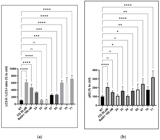 Effect of compounds 24, 33, 34, 57, 65, 67, 70, and 71 on the autophagic flux in SY5Y-APPwt cells. SY5Y-APPwt cells were treated for 24 h with compounds 24, 33, 34, 57, 65, 67, 70, and 71 (3 µM), CQ (20 µM), and bafilomycin A1 (BafA1) at 100 nM as the control. Cell lysates were immunolabeled with the following antibodies: p62 (a), LC3 (b), and β-actin. Statistical significance was set at * p < 0.05, ** p < 0.001, *** p < 0.001, **** p < 0.0001, and ns as not significant.
