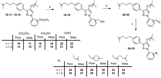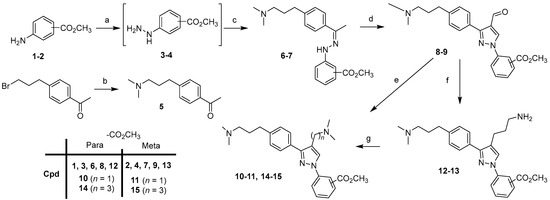 For the synthesis of the first series with (N,N-dimethylamino)alkyl groups in the 4-position of the pyrazole scaffold of compounds 24–35, we first describe the preparation of intermediates 10–11, 14–15 (Scheme 1).