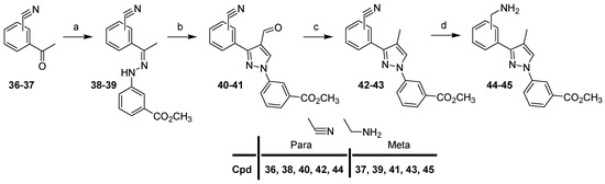 Compound 4 and 4-or 3-cyanoacetophenone (36–37) were condensed in methanol to provide hydrazone derivatives 38–39, which were then treated with Vilsmeier–Haack reagent with POCl3 in DMF to afford pyrazoles 40–41. Selective reduction of the aldehyde functions (40–41) with triethylsilane and trifluoroacetic acid gave nitrile derivatives 42–43, which were reduced with the borane–THF complex in THF to afford compounds 44–45.