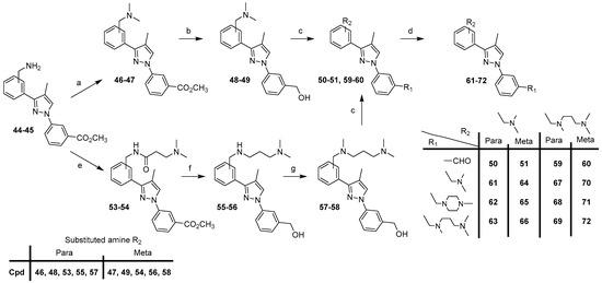 For the synthesis of the second series with a methyl group in the 4-position of the pyrazole scaffold (compounds 61–72), we first describe the preparation of intermediates 44–45 (Scheme 3).