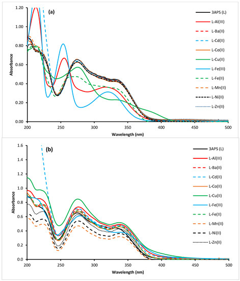 UV–VIS absorption of 3APS (2 × 10−5 M) in the absence and presence of tested metal solution (Al(III), Ba(II), Cd(II), Co(II), Cu(II), Fe(III), Fe(II), Mn(II), Ni(II), and Zn(II)) at 1 × 10−4 M each in H2O–ACN (9:1) (a) and in H2O–ACN (1:9) (b).