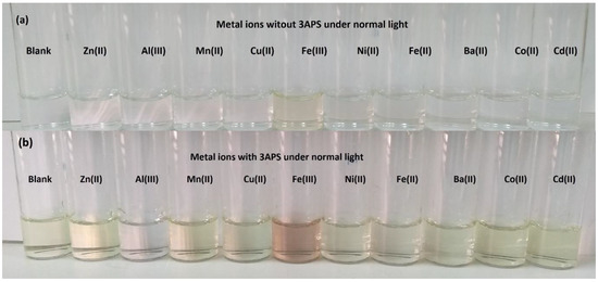 Visual representation of metal solutions (1 × 10−4 M) without (a) and with 3APS (2 × 10−5 M) (b) in H2O–ACN (9:1) under normal light.