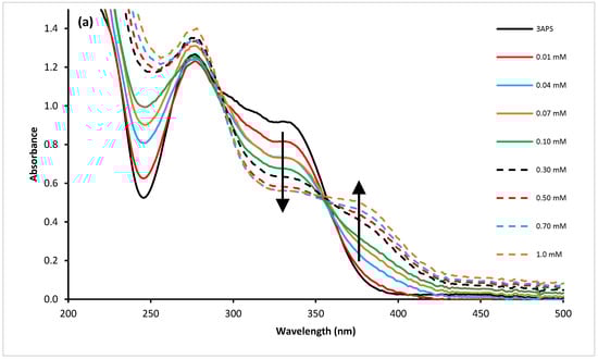 To study the solvent effect on the absorbance of the sensor, solutions of 1.0 × 10−3 M of 3APS in ethanol, acetonitrile (ACN), methanol, and water were prepared, and their absorbance spectra were measured. The compound showed similar absorbance profiles in all investigated aprotic polar solvents. However, due to the low solubility of 3APS in water, its aqueous solution showed very low absorbance over the investigated wavelength range. For environmental applications, it is crucial to develop sensors that work in aqueous media; therefore, the use of H2O–ACN (9:1) as a mixed solvent was adopted.