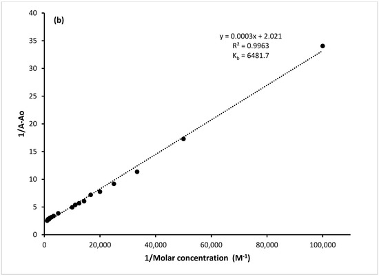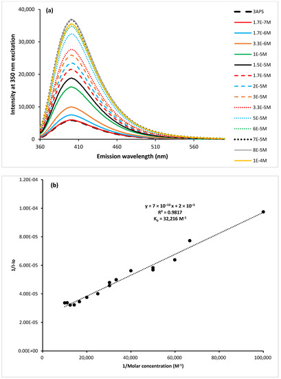 A solution of 3APS (2 × 10−6 M each) was titrated with varying concentrations of an Al(III) solution (1.7 × 10−7 M–1× 10−4 M) at an excitation wavelength of 350 nm. The fluorescence intensity of 3APS at 405 nm enhanced gradually upon adding Al(III) and reached a saturation level at a concentration of 9 × 10−5 M, as shown in Figure 8a. The 3APS binding constant with Al(III) was determined using the Benesi–Hildebrand method and found to be 3.2 × 104 M−1, as shown in Figure 8b. The limit of detection (3.3σ/slope) [52,53] for Al(III) was found to be 0.75 μM (0.020 mg/L), which is much lower than the maximum acceptable concentration for total aluminum in drinking water in Canada (2.9 mg/L) [14] and the USEPA secondary maximum contamination limit (0.05 to 0.2 mg/L) [15].