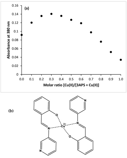 The stoichiometric ratio of Cu(II) to 3APS was calculated from Job’s plot, as shown in Figure 5a. Solutions of equal concentrations (1 × 10−4 M) of Cu(II) in water and 3APS in ACN were mixed at varying ratios (9:1, 8:2, 7:3, 6:4, 5:5, 4:6, 3:7, 2:8, 1:9, and 0:10) to produce a final concentration of 1 × 10−5 M, and the absorbance of each solution was measured at 385 nm. The apex indicates a stoichiometric ratio of 2:1 between 3APS and Cu(II). The possible structure for the complex is presented in Figure 5b, where Cu(II) binds the two 3APS molecules at the phenolic–OH groups and the imine Ns, as reported by Wang and Zheng [50]. We were unable to obtain crystals of the complex, possibly due to the solubility of the complex in water, causing it not to crystalize. This proposed structure for the complex is mainly based on Job’s plot and published data [50].