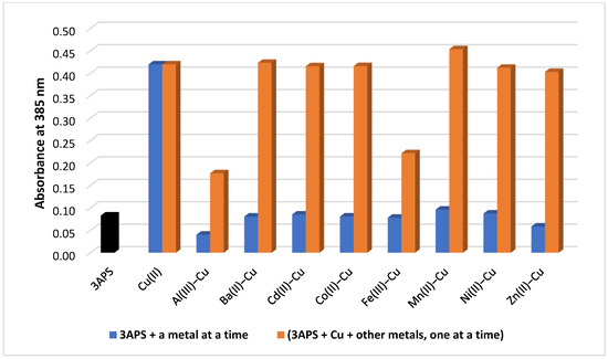 Absorbance interference of other metal ions with a 3APS–Cu(II) system measured at 385 nm. The blue color represents the absorbance of the mixture of 3APS with each metal ion individually, and the orange color represents the absorbance of the 3APS–Cu after the addition of each metal ion at a molar ratio of 1:2.
