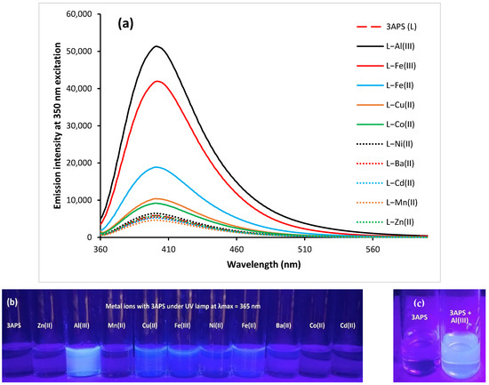A solution of 3APS (2 × 10−4 M) in ACN was mixed with various metal solutions (1 × 10−3 M) in deionized water, one at a time to produce solutions containing 2 × 10−6 M 3APS and 1 × 10−4 M of each metal in H2O–ACN (9:1). The emission for each solution was measured at an excitation wavelength of 350 nm. It is obvious that the intensity of 3APS at 403 nm enhanced greatly (sevenfold) after the addition of Al(III), followed by Fe(III) (sixfold), Fe(II) (fourfold), and Cu(II) and Co(II) (about twofold each). The rest of the metals did not provide any appreciable enhancement, as shown in Figure 7a. The fluorescence of the 3APS–metal interactions was also visually taken at 365 nm, as shown in Figure 7b,c. Apparent fluorescence was observed upon the addition of Al(III), Cu(II), Fe(III), and Fe(II). It is worth mentioning that 3APS was employed earlier [51] as a sensor for the detection of Ba(II) in the presence of several metal ions similar to those investigated in the current work. However, the 3APS–metal mixtures investigated in Zhao et al. [51] were buffered at pH 7.0 using HEPES (4-(2-hydroxyethyl)-1-piperazineethanesulfonic acid). Discrepancies between our results and the reported one could be explained by the effect of buffer on the binding ability of 3APS to different metal ions.