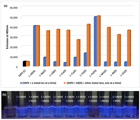 To evaluate the interference of other metal ions with the 3APS–Al(III) interaction, the fluorescence response of 3APS to various metal ions in the presence of Al(III) in H2O–ACN (9:1) was investigated, and the results are shown in Figure 10a. The concentration of each of the other metal ions added to the 3APS–Al(III) solution was 10-fold higher. Only minimal interferences in the 3APS–Al(III) emission intensity were observed from all metals (±10%), except Ni(II) (reduction in intensity) and Fe(III) (enhancement in intensity) with about 20% interference, while Cu(II) showed about 35% interference as intensity reduction. This effect may be due to the similar coordination behaviors of the later three metal ions (i.e., Ni(II), Fe(III), and Cu(II)) [54]. The interference of various metal ions with 3APS–Al(III) interaction was also visually investigated under UV lamp at 365 nm, as illustrated in Figure 10b, which exhibits a clear visual effect for Fe(III) on the 3APS–Al(III) complex.