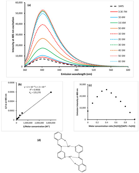 Solutions of 3APS (2 × 10−6 M each) were titrated with Fe(III) solutions of varying concentrations (3.3 × 10−7 M–6 × 10−5 M) at λex 405 nm. Upon adding Fe(III), the fluorescence intensity of 3APS increased from its initial value to reach a saturation level at 5.0 × 10−5 M and started to diminish afterwards, as shown in Figure 11a. The Benesi–Hildebrand plot was developed, and the binding constant was calculated to be 1.25 × 105 M−1, as shown in Figure 11b. The limit of detection (3.3σ/slope) [52,53] for Fe(III) turned out to be 1.19 µM (0.0066 mg/L), which is lower than the USEPA secondary maximum contamination limit (0.300 mg/L) [15]. To further clarify the coordination stoichiometry of 3APS with Fe(III), Job’s plot using fluorescence data was developed, and a ratio of about 1:1 was observed, as shown in Figure 11c. Similar findings were reported by another researcher [42]. A possible complex structure could be with the binding sites as the phenolic–OH group, the imine N and the pyridine N, as suggested earlier for Al(III) to satisfy the oxidation state of Fe(III), as shown in Figure 11d. Attempts to synthesize the complex were unsuccessful, and no crystals were obtained to confirm the structure by X-ray.