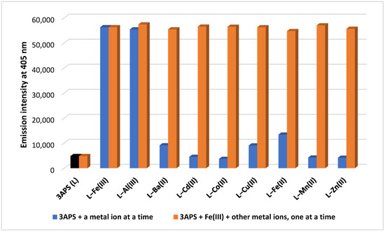 The fluorescence response of 3APS solutions (2 × 10−6 M each) to Fe(III) (1 × 10−6 M) before and after the addition of various metal ions (1.0 × 10−5 M each) in H2O–ACN (9:1) was investigated, and the results are shown in Figure 12. The fluorescence was recorded at λex 350 nm and λem 405 nm. Apart from Al(III), the 3APS sensor showed high selectivity for Fe(III) in the presence of other metal ions, where the interference was ~5%.