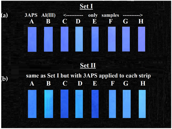 We chose four bars of antiperspirant deodorants (C, D, E, F) and two antiperspirant dry sprays (G and H), which are commercially available in Qatar, of which D was labelled as containing aluminum zirconium tetrachlorohydrex GLY 15.2%, F contained 19.2% Al, G and H contained aluminum chlorohydrate, and C and E were aluminum free. To test the applicability of employing 3APS as a sensor for Al(III) in these commercial products, 16 strips of Schleicher and Schuell ashless filter papers were grouped into two sets. For the first set (Set I, Figure 13a), each sample was applied to a different strip. A blank strip containing only 3APS and a control strip coated with Al(III) solution were also used. The same application was performed to the other set but with 3APS applied to each strip (Set II, Figure 13b). The two sets were visualized under UV lamp at 365 nm. It is obvious that the samples containing aluminum (D, F, G, and H) showed blue fluorescence, while the Al-free samples (C and E) showed no fluorescence. The control strip (B), which is 3APS–Al(III) coated, also showed blue fluorescence.