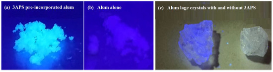 3APS preincorporated with alum under UV lamp at 365 nm (a); alum by itself under UV lamp at 365 nm (b); two large crystals of alum, the first preincorporated with 3APS during its preparation and the other without 3APS under UV lamp at 365 nm (c).