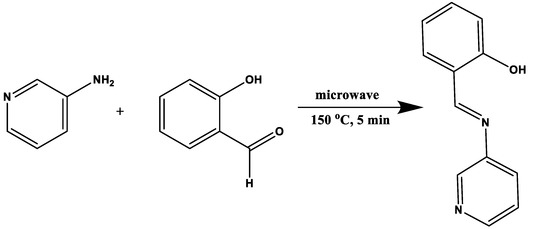 (E)-2-((pyridine-3-ylimino) methyl) phenol (3APS) was prepared as follows: An amount of 1.97 mmol of 3-aminopyridine was dissolved in 5.0 mL of absolute ethanol inside a microwave glass vessel, followed by the addition of 1.2 eq of o-salicylaldehyde. The mixture was microwaved for 5 min at 150 °C. After removal of the solvent in vacuo, the residue was cooled to room temperature, obtaining a yellow solid. Pure 3APS was obtained (0.37 g) after recrystallizing twice from absolute ethanol (95% yield). 1H-NMR (DMSO, TMS): δ 12.59 (s, 1H), 9.02 (s, 1H), 8.63 (d, J = 2.4 Hz, 1H), 8.51 (d, J = 4.65 Hz, 1H), 7.88 (t, J = 9.29 Hz, 1H), 7.69 (d, J = 7.83 Hz, 1H), 7.52–7.43 (2H), 7.01 (t, J = 7.58 Hz, 2H). 13C-NMR (DMSO, TMS) 165.62 (1C-O, benzene), 160.61 (1C-imine), 148.20 (1C, -N=C, 3-pyridine), 145.00 (1C, imine-N, 3-pyridine), 143.96 (1C, 3-pyridine), 34.23 (1C, benzene), 132.96 (1C, benzene), 128.41 (1C, pyridine), 124.64 (1C, pyridine), 119.86 (1C, benzene), 119.79 (1C, benzene), 117.17 (1C, benzene). IR: 1613 cm−1 imine group (-C=N), 1568 cm−1 (C=C), 1476.84 cm−1 (-C-N-), 1283 cm−1 group (-C-O-), and OH have very low broad absorption at 2000–3500 cm−1. Anal. Calcd for C12H10N2O (198.08): C, 72.71%; H, 5.08%; N, 14.13%. Found: C, 72.72%; H, 4.08%; N, 14.39%. The structures and synthetic route are shown in Scheme 1.