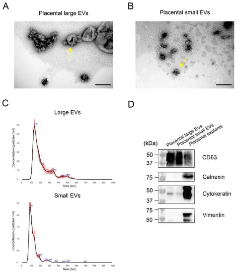 Characterization of the large- and small-extracellular vesicles (EVs) derived from the human term placentae. Representative electron micrograph of the characteristic morphology of the isolated large EVs with diameters of approximately 170 nm (yellow arrow) (A) and small EVs with diameters of approximately 60 nm (yellow arrow) (B), Scale bar = 200 nm. Nanoparticle tracking analysis of the size distribution in the large and small EVs, using the NanoSight NS300 system (C), error bars indicate ± 1 standard error of the mean ( n = 3 in each group). Representative western blots of specific markers present in the large and small EVs, derived from human placentae: CD63, Calnexin, Cytokeratin and Vimentin (D). A lysate of the placental explants served as a control.