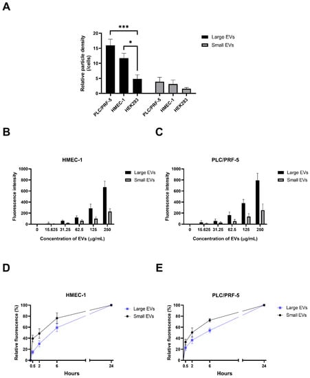 The interaction of the placental EVs with different recipient cells. (A) The interaction of the CellTrackerTM Red CMTPX-labelled placental large and small EVs with PLC/PRF-5, HMEC-1 or HEK293 recipient cells was examined by fluorscent microscopy and quantified using ImageJ 1.50i software (National Institutes of Health, Bethesda, MD, USA) (n = 3). Differences among the groups were tested with a RM one-way ANOVA with multiple comparisons (* p < 0.05, *** p < 0.001). Increasing doses of placental EVs, ranging from 0 to 250 µg/mL, were exposed to (B) HMEC-1 cells or (C) PLC/PRF-5 for 2 h (n = 4). Following the washing, the red fluorescence intensity was quantified using a BioTek Synergy 2 microplate reader (Agilent, Santa Clara, CA, USA). The time-dependence of the interaction of the CMTPX-labelled large and small placental EVs (250 µg/mL) with (D) HMEC-1 endothelial or (E) PLC/PRF-5 liver cells, was quantified by measuring the fluorescence intensity using a BioTek Synergy 2 microplate reader (Agilent, Santa Clara, CA, USA) and normalized to the reading at 24 h. Cells were exposed to the EVs for times ranging from 0.5–24 h (n = 4).