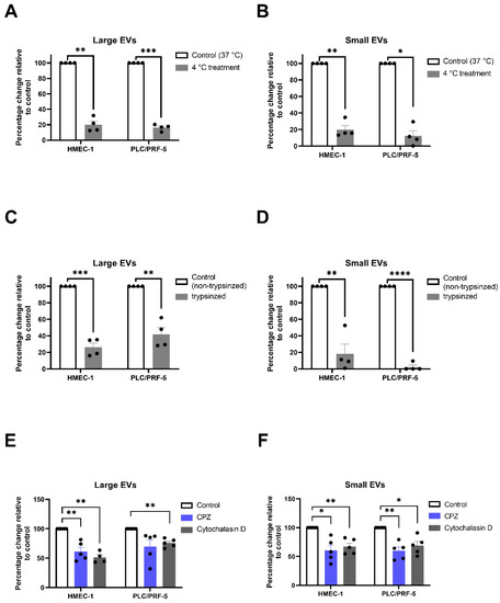 Inhibition of the interaction of the placental EVs with the recipient cells. HMEC-1 and PLC/PRF-5 were pre-cultured at 4 °C for 0.5 h. Fluorescently labelled placental (A) large or (B) small EVs were added, and the cultures continued for 2 h at 4 °C (n = 4). HMEC-1 and PLC/PRF-5 were treated with placental (C) large or (D) small EVs that had been treated with 0.25% (w/v) trypsin, for 2 h (n = 4). HMEC-1 and PLC/PRF-5 were pre-treated with cytochalasin D (10 µg/mL) or chlorpromazine hydrochloride (CPZ, 10 µg/mL) for 30 min, and the fluorescently labelled placental (E) large or (F) small EVs were added to the cultures in the presence or absence of the inhibitors for 2 h (n = 4–5). The interaction of the EVs was quantified using a BioTek Synergy 2 microplate reader (Agilent, CA, USA). Values were normalized to control EV group and shown as mean ± SEM. Differences between the two groups were tested with a paired t-test (* p < 0.05, ** p < 0.01, *** p < 0.001, **** p < 0.0001).