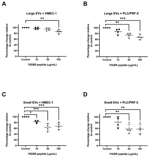 YIGSR peptide reduced the interaction of the placental EVs with the endothelial and liver cells. Fluorescently labelled placental large or small EVs were incubated with increasing concentrations of the YIGSR peptide (n = 4), and the interaction with the HMEC-1 or PLC/PRF-5 cells was quantified using a BioTek Synergy 2 microplate reader (Agilent, CA, USA). The interaction of the placental (A) large or (C) small EVs with the HEMC-1 cells was significantly reduced by the YIGSR peptide pre-treatment at the concentration of 100 µg/mL and 10 µg/mL, respectively. The interaction of the placental (B) large or (D) small EVs with the PLC/PRF-5 cells was significantly reduced by the YIGSR peptide pre-treatment at the concentration of 50 µg/mL compared to no YIGSR peptide pre-treatment. Values were normalized to the untreated HMEC-1 or PLC/PRF-5 cells. Data are shown as mean ± SEM. Differences among the groups were tested with a RM one-way ANOVA with multiple comparisons (* p < 0.05, ** p < 0.01, *** p < 0.001).