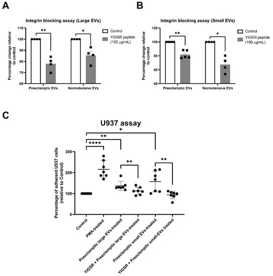 HMEC-1 endothelial cell activation was measured using a monocyte adhesion, as described previously [25,52] The pre-treatment EVs derived from preeclamptic placentae with YIGSR peptide (100 µg/mL) for 2 h. Following a washing out of the peptide, the EVs were exposed to confluent HMEC-1 cells in quadruplicate, for 24 h at 37 °C. Cells were then washed, and CellTrackerTM Green CMFDA-labelled U937 monocytes were added (1 × 104 monocytes/well of a 96-well plate). The monocytes and HMEC-1 cells were co-cultured for 6 h at 37 °C. Then, the unbound monocytes were thoroughly washed off with PBS, and the adherent monocytes were measured using a BioTek Synergy 2 microplate reader (Agilent, CA, USA) at Excitation/Emission: 485/20,528/20 nm. The fluorescence intensity was expressed as a percentage of the adherent U937 cells to HMEC-1, compared to the untreated cells. As a positive control, we activated the endothelial cells with Phorbol 12-myristate 13-acetate (PMA, 10 ng/mL; Sigma Aldrich, Saint Louis, MO, USA).