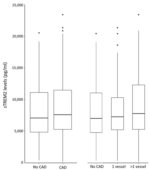 sTREM2 levels were compared in the CAD vs. non-CAD groups and in patients with single-vessel or multi-vessel disease (Figure 1). No significant changes in sTREM2 levels were noted in either CAD vs. non-CAD patients (p = 0.642), non-CAD patients vs. single- and multi-vessel disease (p = 0.806), or single- vs. multi-vessel disease (p = 0.720).