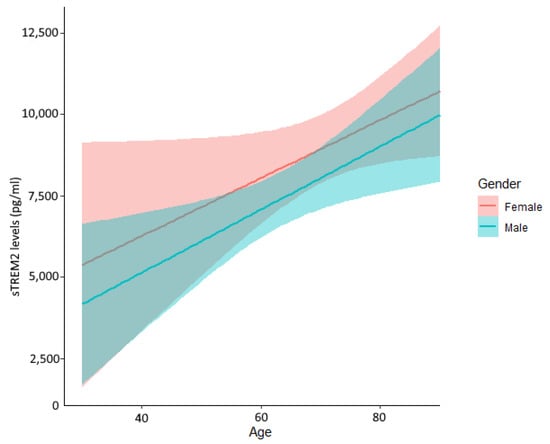 Circulating soluble TREM2 levels stratified by age and sex. All patients were included. sTREM2 level is associated with age in both males and females.